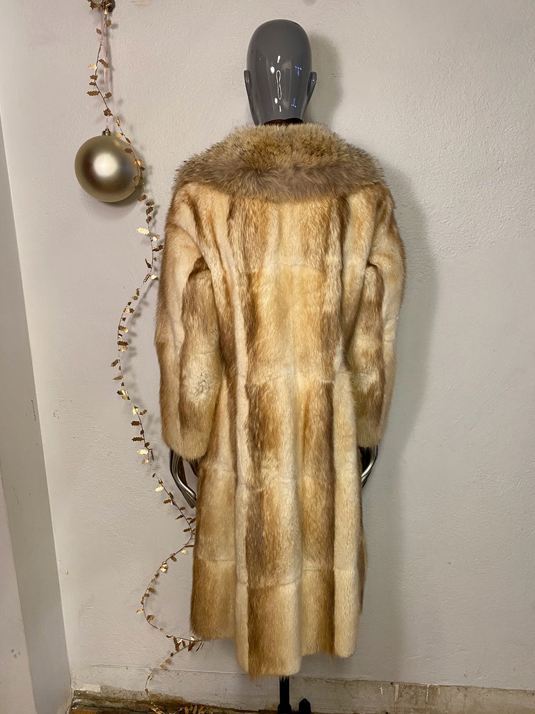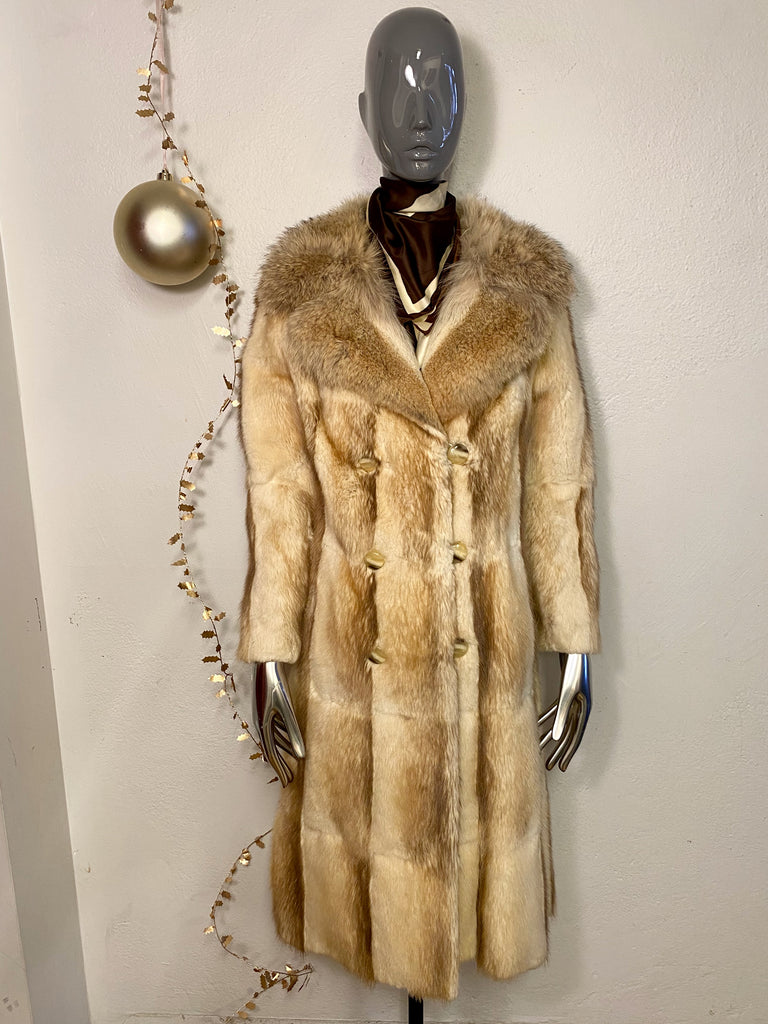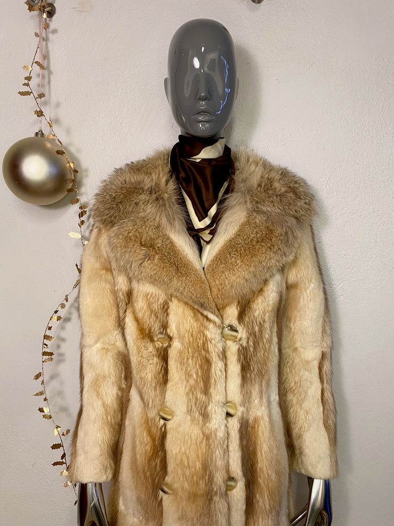Vintage fur coat with notch lapels and double breasted styling. The lining has been replaced and is in like new condition with attached inner ties. Matching buttons with elastic makes for easy closure. With its unusual cream undertones, this stylish fur will help you to stand out in any crowd and as an added bonus, you will be the warmest!