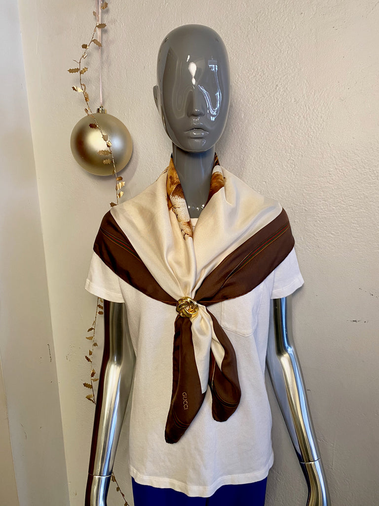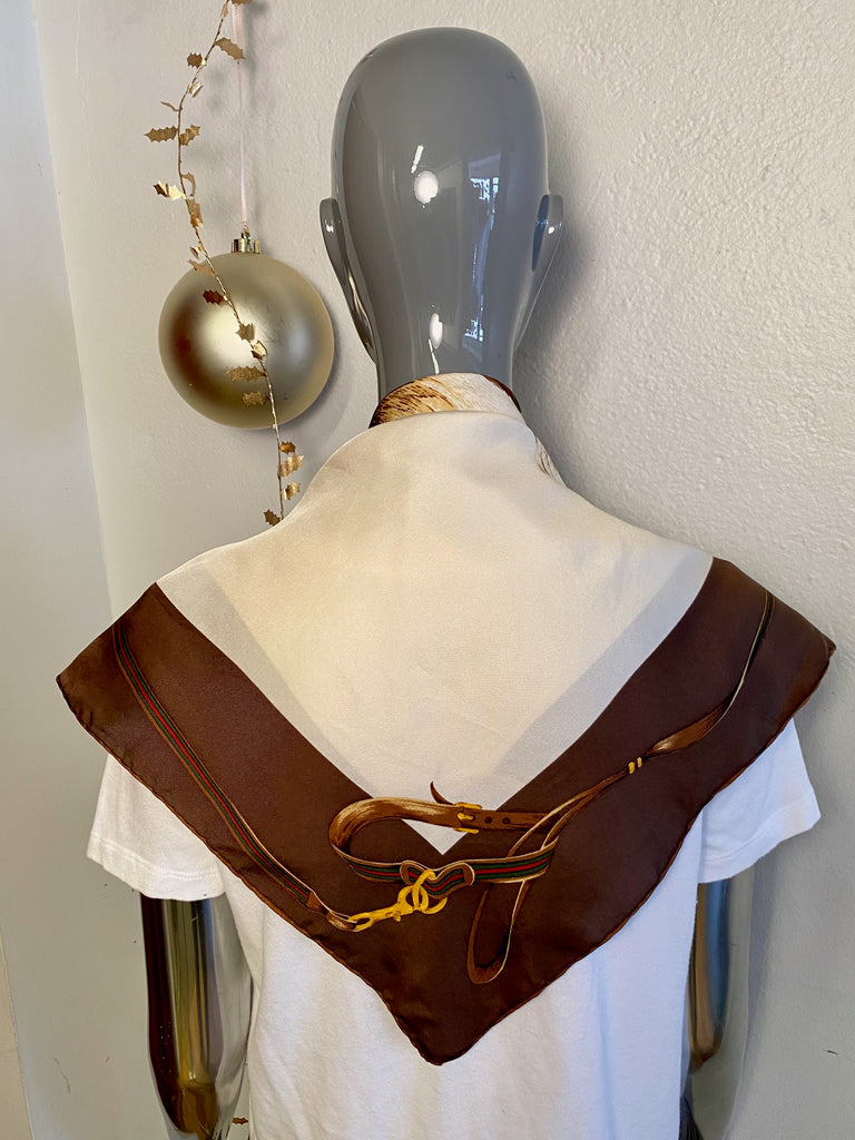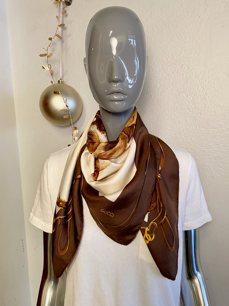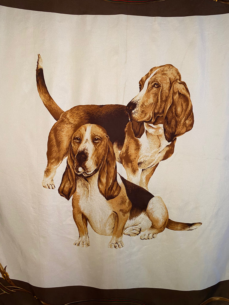 Vintage scarf featuring two Basset Hounds on a cream background with chocolate brown border. The border detail has the house of Gucci signature green and red colours on a painted belt.