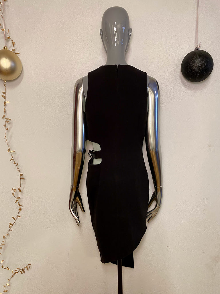 Preloved dress from designer Anthony Vaccarello. This dress was shown on the runway in his Fall Winter Collection 2015 and features a high neckline. The sleeveless little black dress also has a cut-out at the waist with leather trimmed buckle, which is adjustable. Eye catching star grommets adorn the asymmetric hem of the skirt. The dress is revealing in all the right places! Fully lined, with back zip.