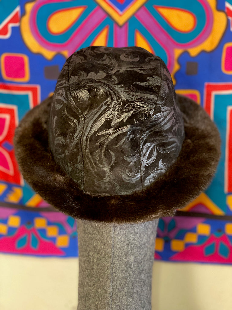 Vintage patterned leather hat with black mink trim. Lining has been remade.