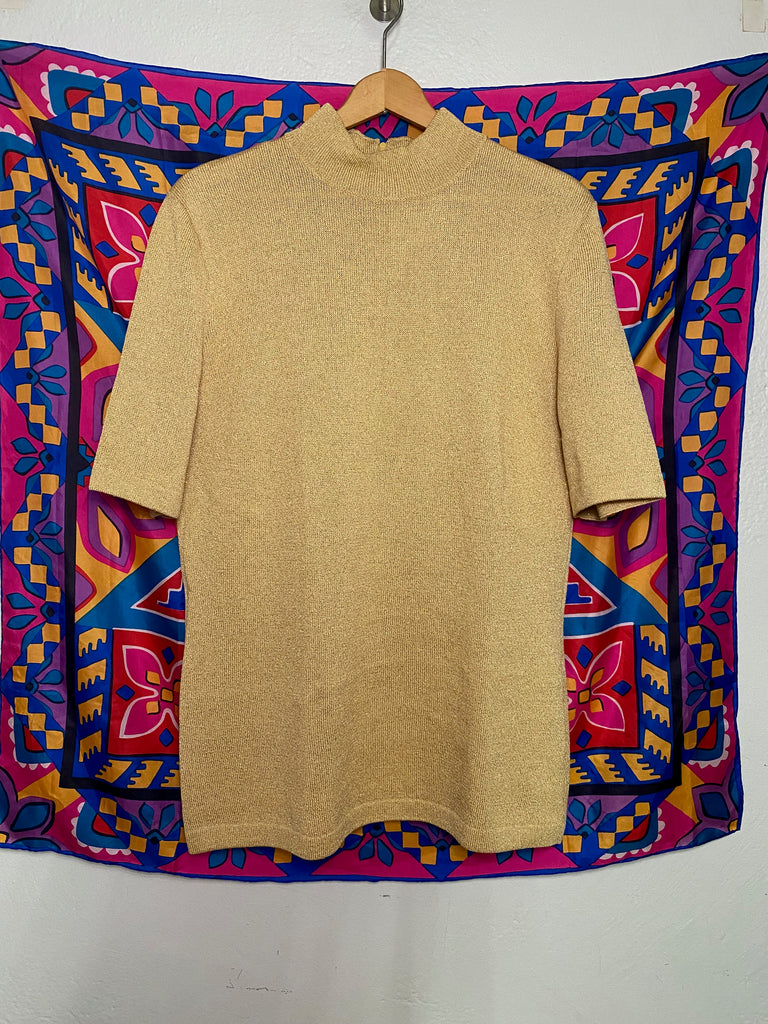 The mock neck sweater has short sleeves and gold lamé thread throughout. Unlined. In excellent, like new condition.